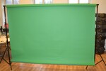 Grüner Hintergrund mit Stativ. Mit entsprechenden Apps oder Software kann der Hintergrund ersetzt werden